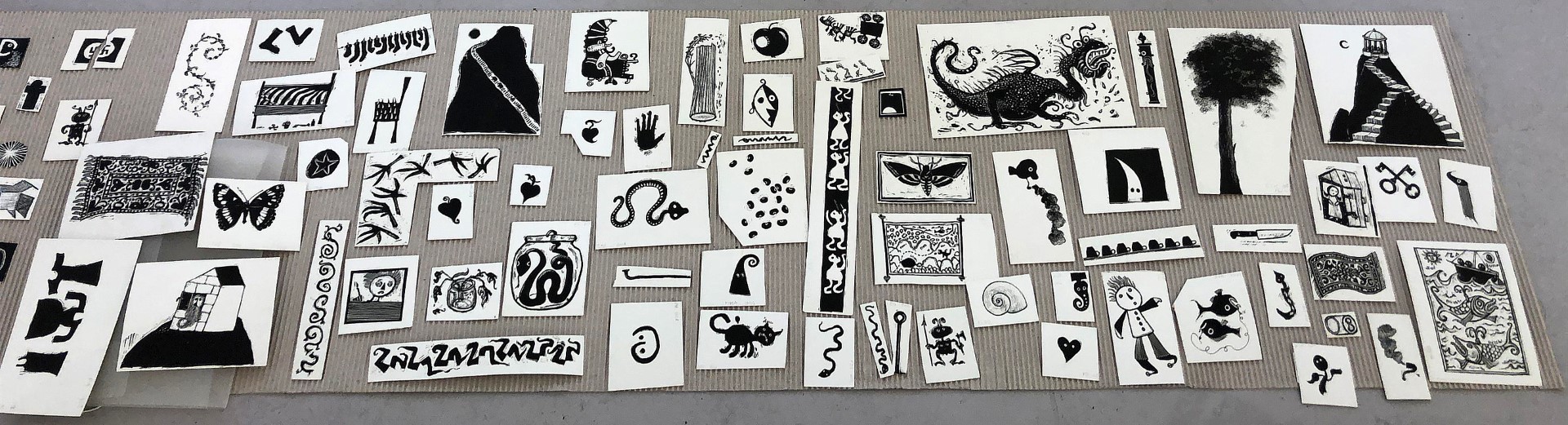 Enkele tientallen zwart-wit illustraties in scraperboard techniek.