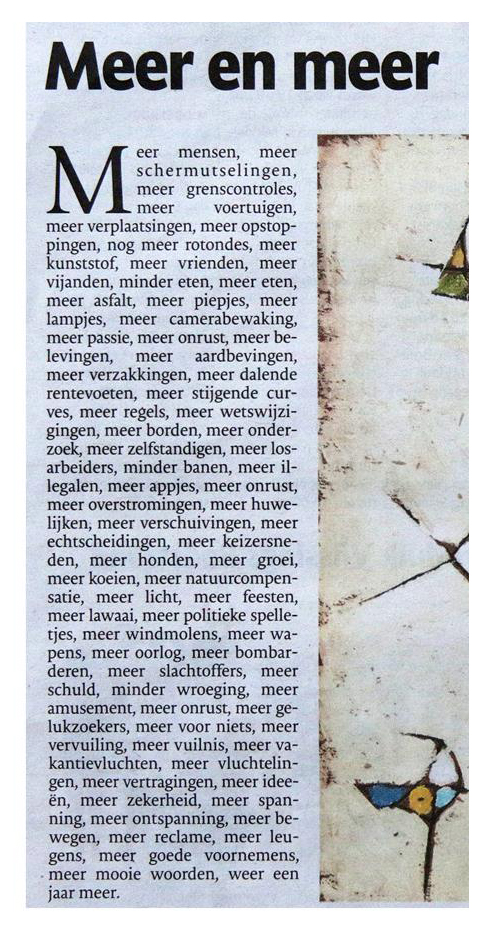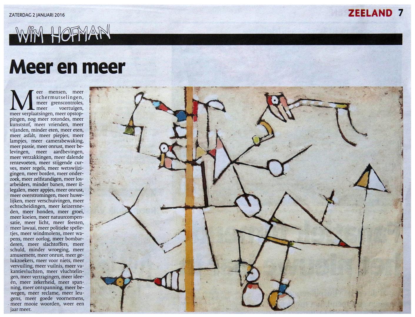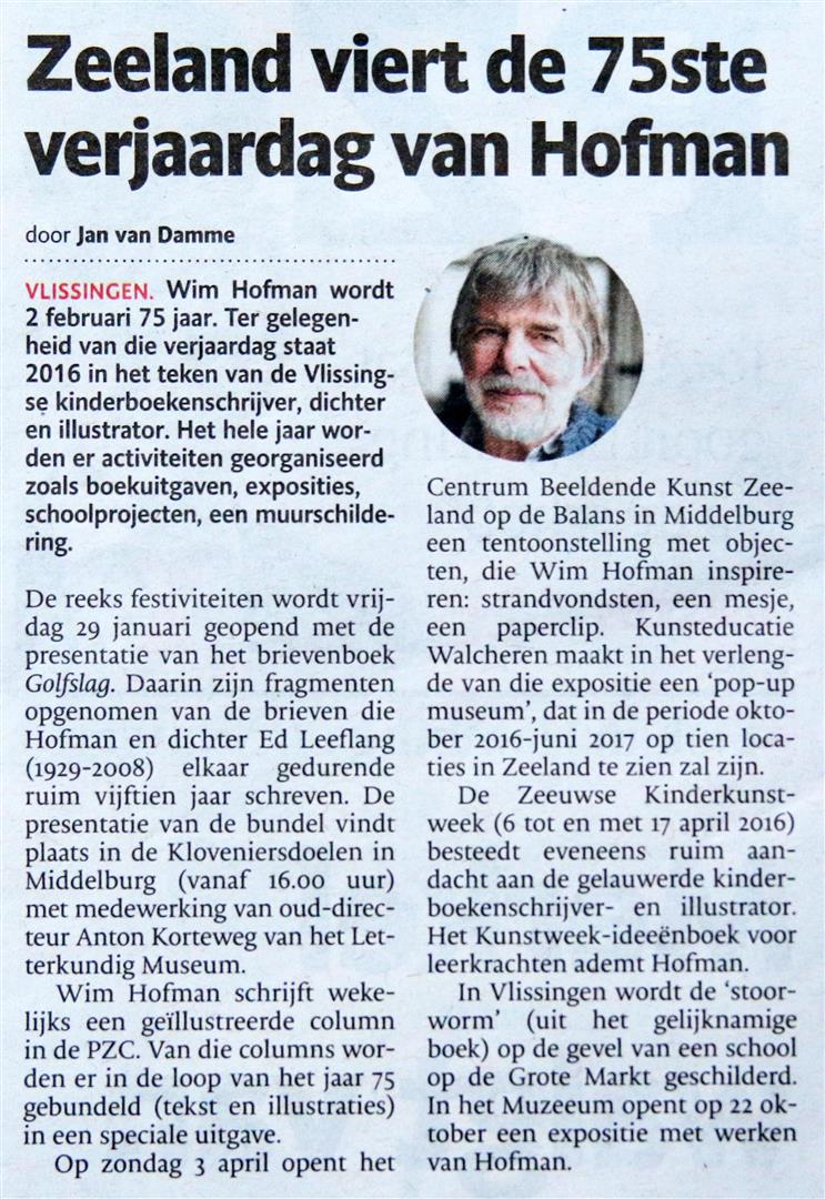 Schrijver/beeldend kunstenaar WIM HOFMAN wordt dit jaar 75 jaar. Dit wordt onder meer gevierd met de uitgave van twee nieuwe boeken en exposities van zijn beeldende werk op diverse Zeeuwse locaties. Vandaag in de Provinciale Zeeuwse Courant Wim Hofman's eerste column van dit nieuwe jaar en een boeiende overpeinzing in 'Zeeland geboekt' over zijn poëzie door Mario Molengraaf.