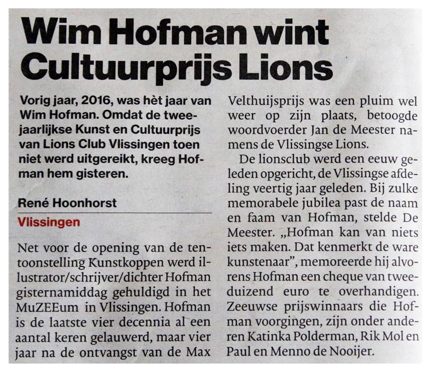 Recent kreeg Wim Hofman in zijn toch al goed gevulde prijzenkast er een prijs bij. De tweejaarlijks uitgereikte - KUNST en CULTUURPRIJS - van de Lions Club Vlissingen. Deze werd hem op 2 november 2017 tijdens een feestelijke bijeenkomst in het Vlissingse maritiem MuZEEum uitgereikt.z